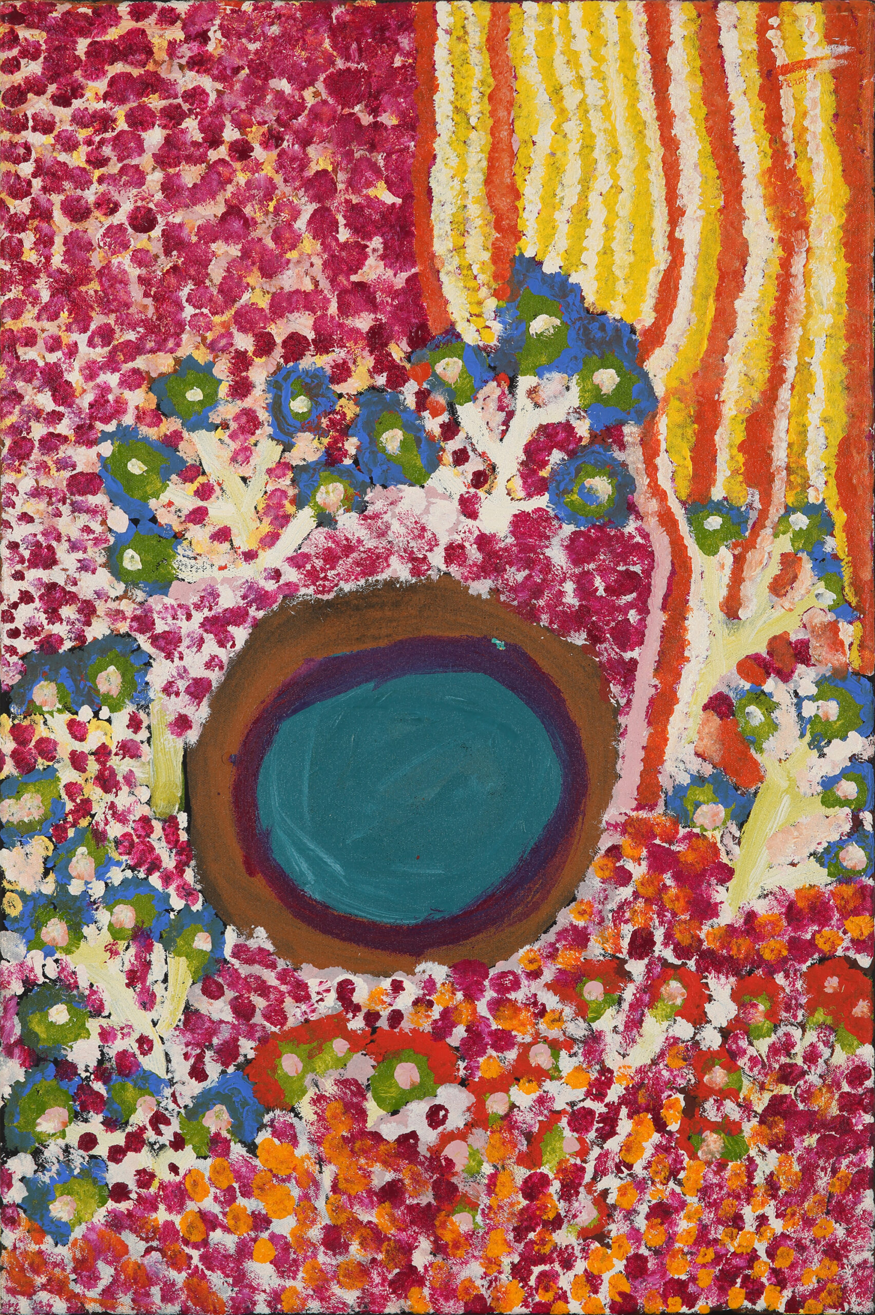 Jessie Kemarr Peterson was born at Hatches Creek in the Davenport Ranges circa 1932 and is now one of the most senior painters living in Wutunugurra (Epenarra). She has been painting with the Epenarra artist collective for decades and has developed an intuitive and confident painting style, which she uses to depict a wide range of subjects, often focusing on country and bush medicine. Jessie records her memories of the ‘old days’ alongside depictions of contemporary life, with her approach to painting encompassing the past, present and future within a single moment.