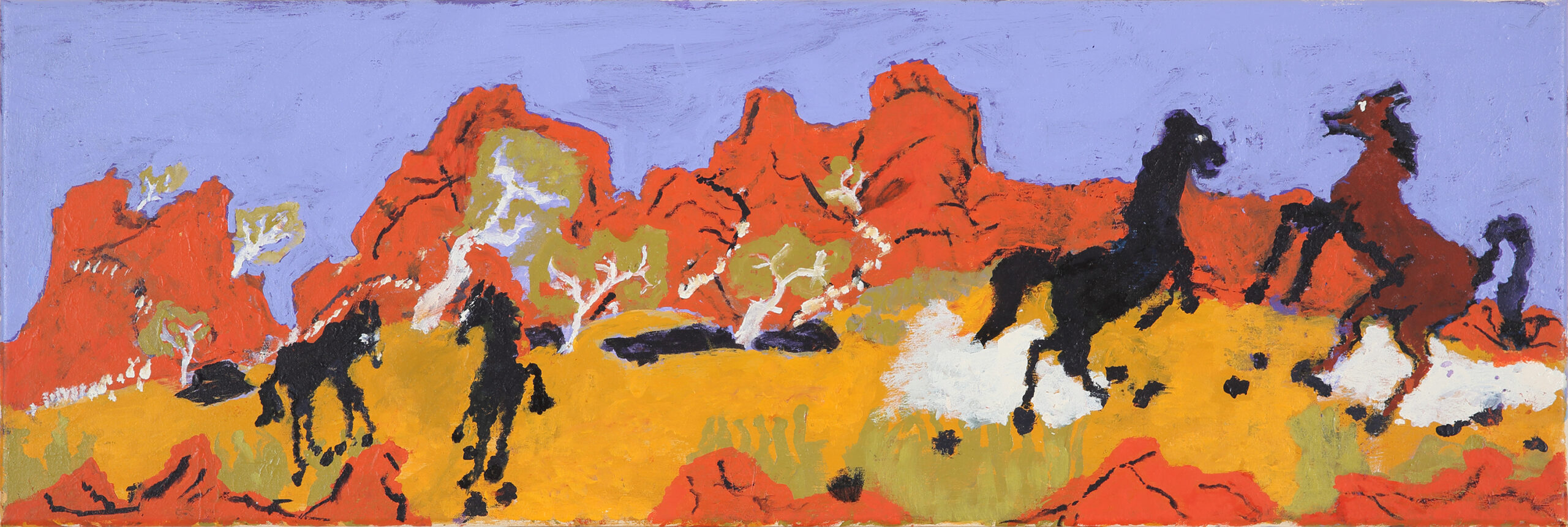 Lance James is from Kaltukatjara (Docker River). He paints Kaltukatjara and the surrounding country, eight hours south-west of Mparntwe (Alice Springs). Since he was a young boy, Lance has painted the horses, bulls and cowboys that occupied his country and his childhood. His affinity with the horse is particularly evident, into which he imbues great movement, strength and grace. His familiarity with his subject matter allows him to capture the essence of a lifestyle long gone. Lance uses humour and sensitivity to explore a narrative of childhood adventure and a love of country.