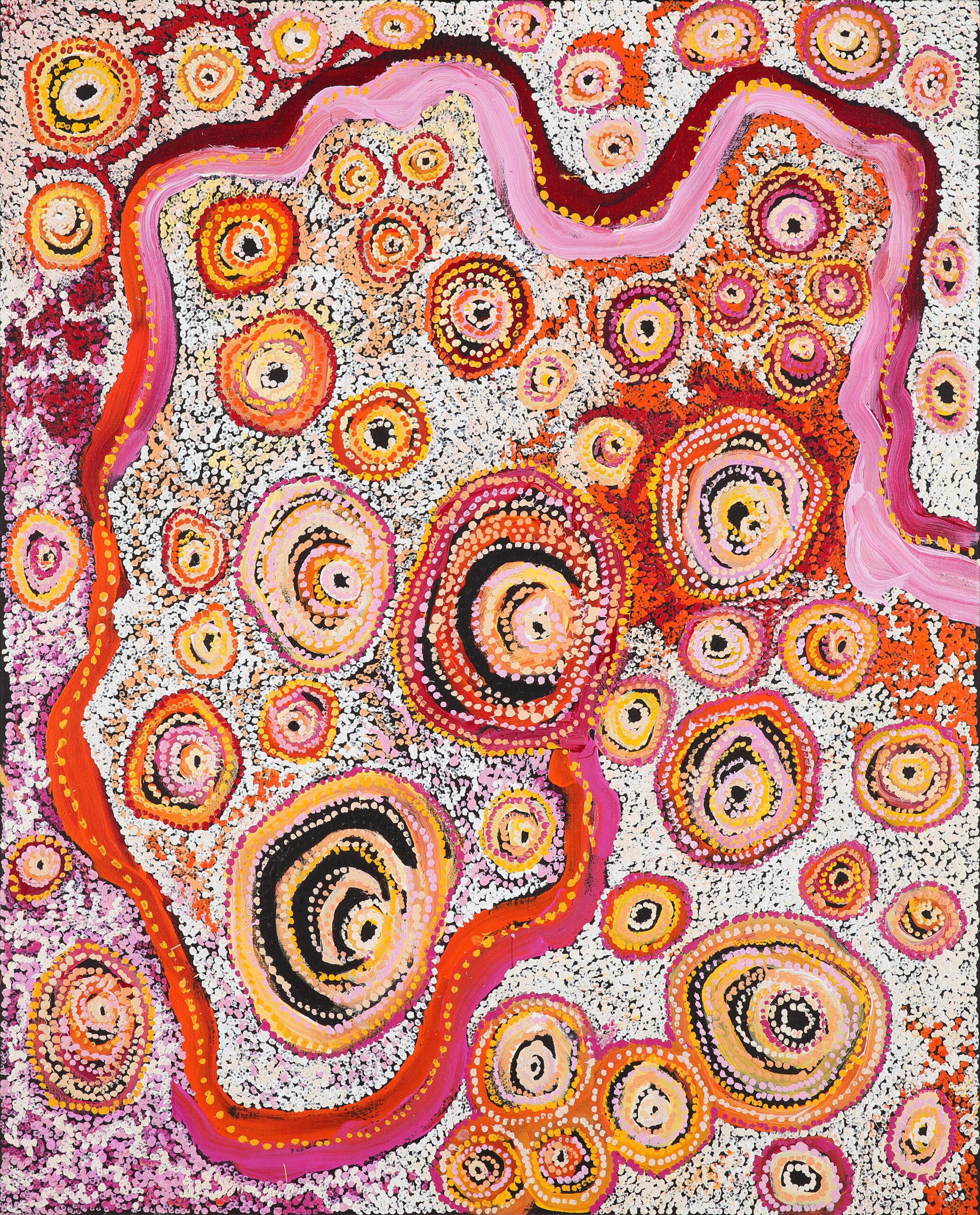 Both Rosalind Tjanyari’s mother and grandmother were famous ngangkari (traditional healers) in the western country of the APY Lands and she has many family members in the Amata community. Rosalind spent a lifetime with her mother and grandmother traveling to visit family and friends in need of healing. Rosalind’s’ paintings allude to a healing energy and strive to encompass the desert landscape. Her artworks speak to a deep history of connection to both country and people. Richly coloured, her paintings reference hidden pathways across the lands and subtly hint at the fluidity of movement and of journeys.