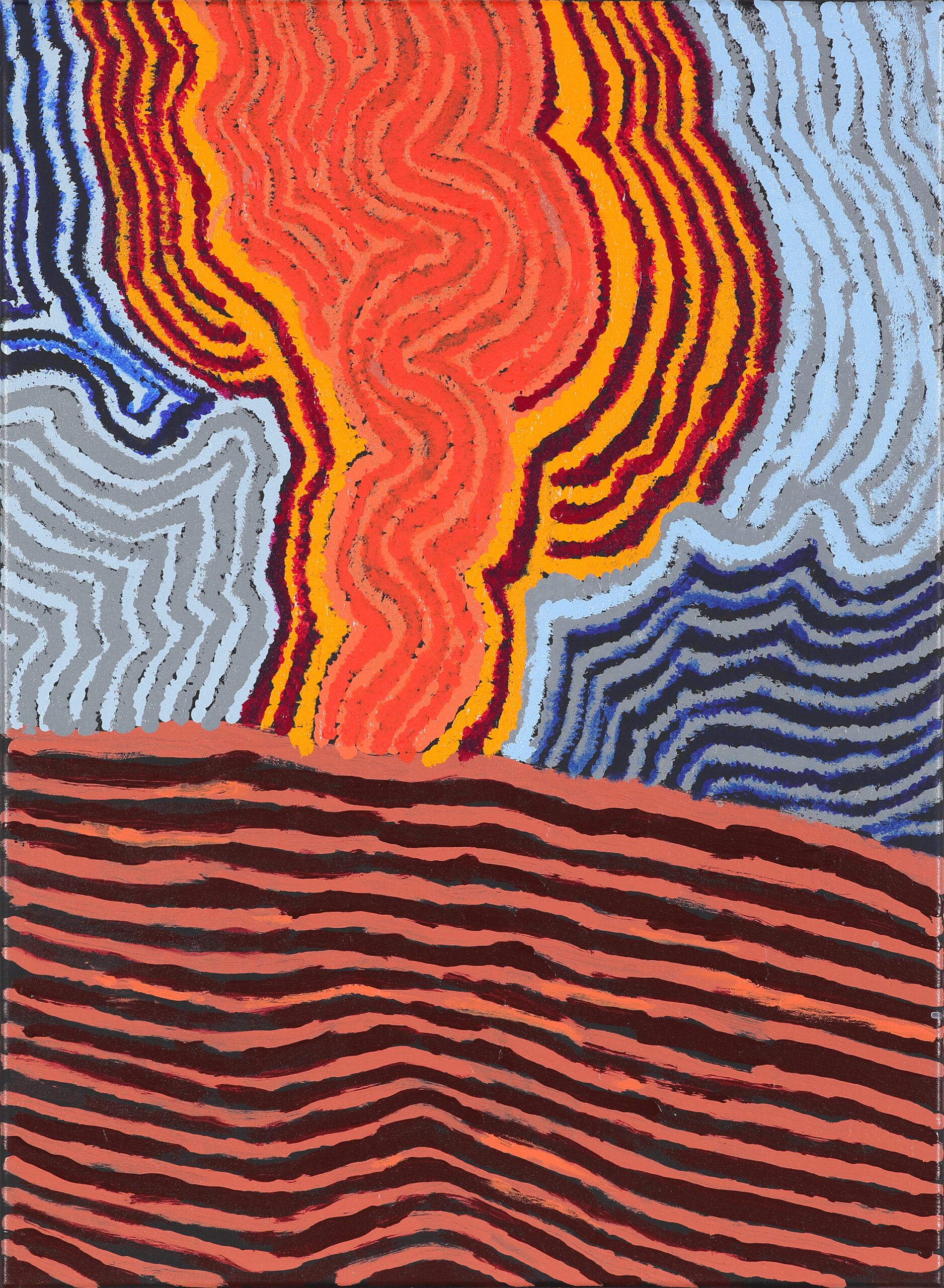 Noreen Parker was born in the bush at Possum Well, a rock hole near Kaltjiti (Fregon) on the APY Lands of South Australia. Her family lived a traditional life and while travelling through country they were directly affected by the first nuclear atomic rocket testing in the 1950s at Emu Fields and the second bomb at Maralinga. Noreen’s paintings focus on the stories passed down to her by her mother.