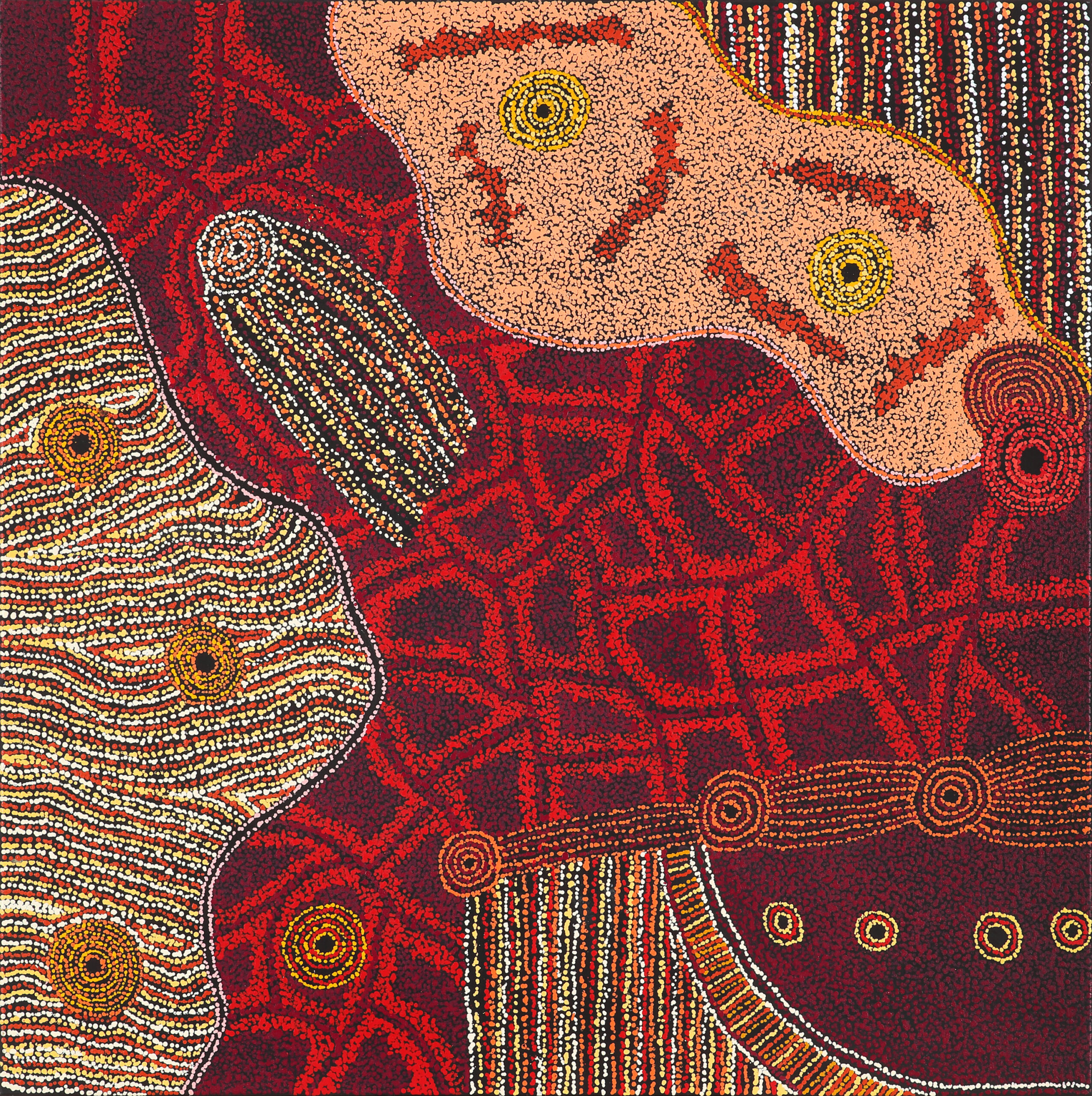 Carol Young remembers spending much of her younger years travelling between communities, particularly Amata and Pipalyatjara. Today, Carol lives in Pipalyatjara and is the primary carer for several of her family members. Carol comes from a strong Anangu family, with both her father and grandmother also being prominent artists. Her father, Stanley Young is also a local elder, lawman, and camel herder. Carol is also the granddaughter of the late Nyankula Watson, an important Western Desert painter. Nyankula has passed down both her tjukurpa and unique style to her granddaughter, which influences Carol’s work today.
