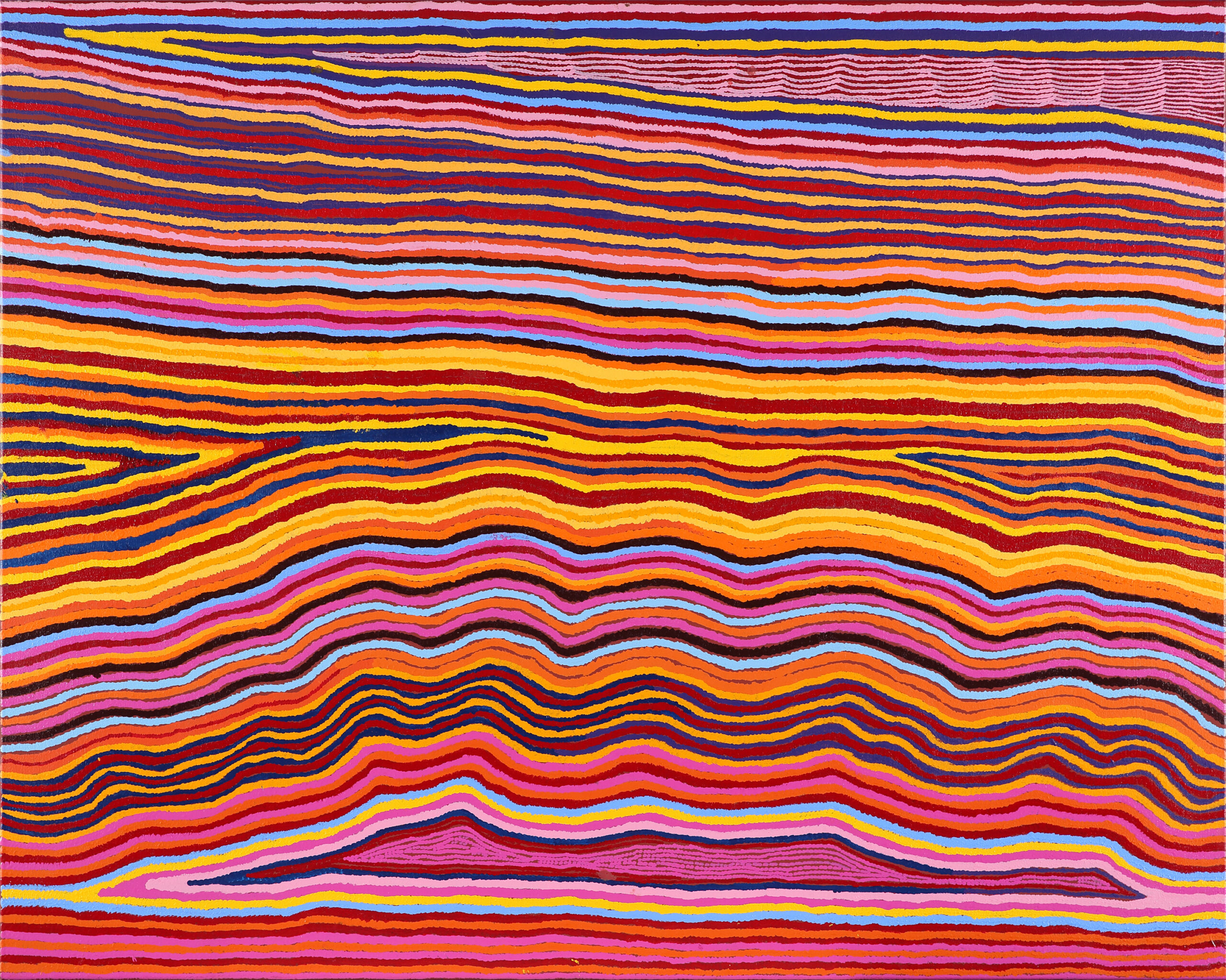 These women here, these dear ones – I’ve painted them here, I’ve created this painting of my grandmother’s, mother’s and grandfather’s country, the dear things, I’ve painted these designs here of those who have been lost. Here they are here in the image, and it is their Tjukurpa that I’ve been voicing now, the dear things. All my grandmothers travelling through. Seven women. Plus the man – so altogether there are eight. That man followed them everywhere. Those poor things were chased all over and that is where the man crouched. This is the Tjukurpa! Yes.