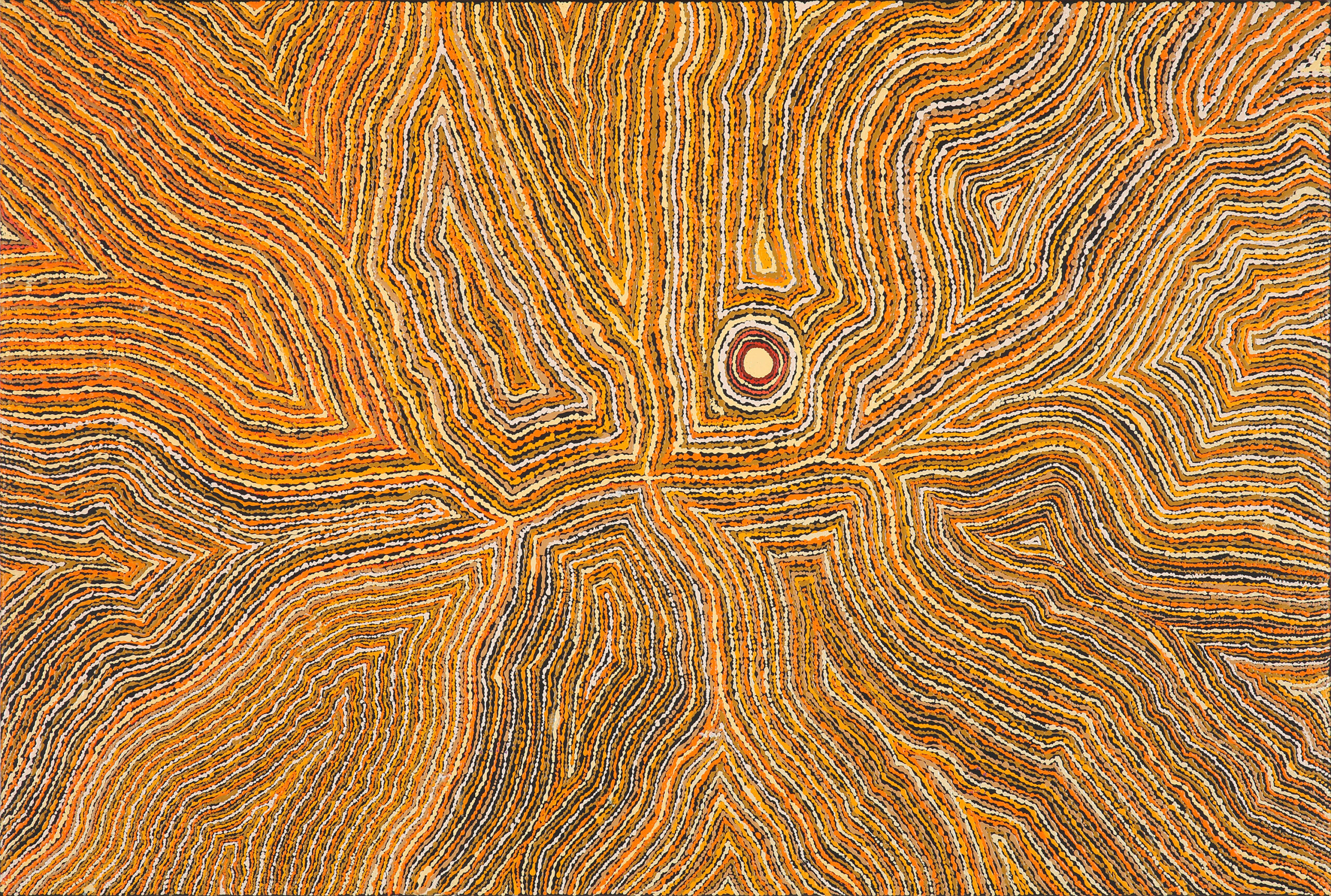 This painting depicts Sharon Doolan’s grandfather’s country. This place is in the Witura National Park on the Northern Territory and South Australia border just south of Aputula (Finke). This area is a beautiful place with plenty of water. There are many trees, lakes and swimming holes.