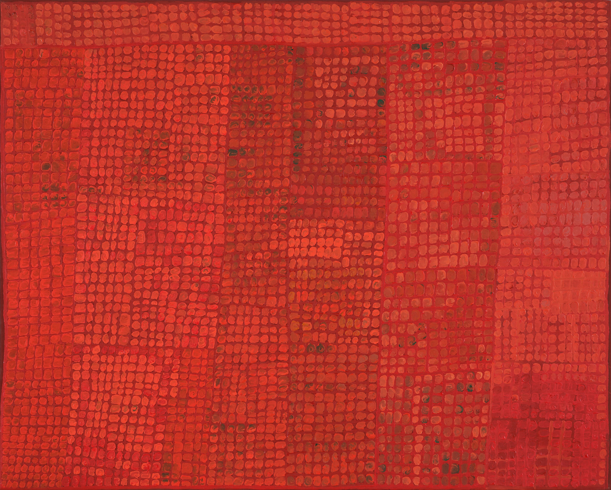 In this work Carbiene McDonald depicts four dreaming stories which he inherited from his father. These tjukurrpa are associated with a series of waterholes running between Kaltukatjara (Docker River) and Kata Tjuta. Specifically, it includes four important sites: Petermann Ranges, Kaltukatjara, Kalaya Murrpu (Blood’s Range) and Mulyayti near Kata Tjuta. As a young man, Carbiene returned to these places and retraced the footsteps of his father. These memories stay with him vividly today.