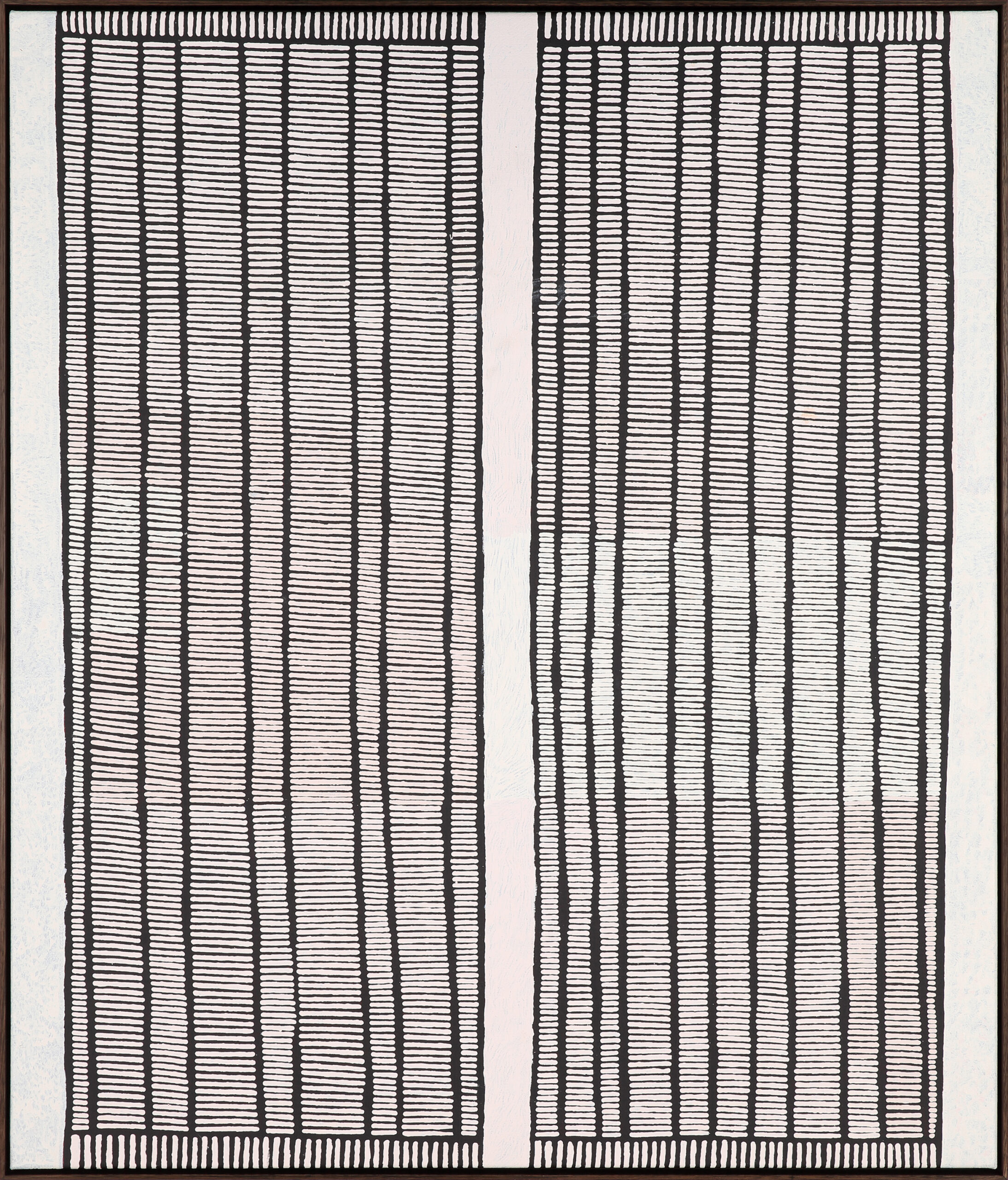 This painting relates to the soakage site of Pinari, north-west of the Walungurru (Kintore) Community. A group of ancestral women once gathered at this site after travelling from further west to perform the dances and sing the songs associated with the area. The women also spun hair-string for making nyimparra (hair-string skirts), which are worn by both men and women during ceremonies.