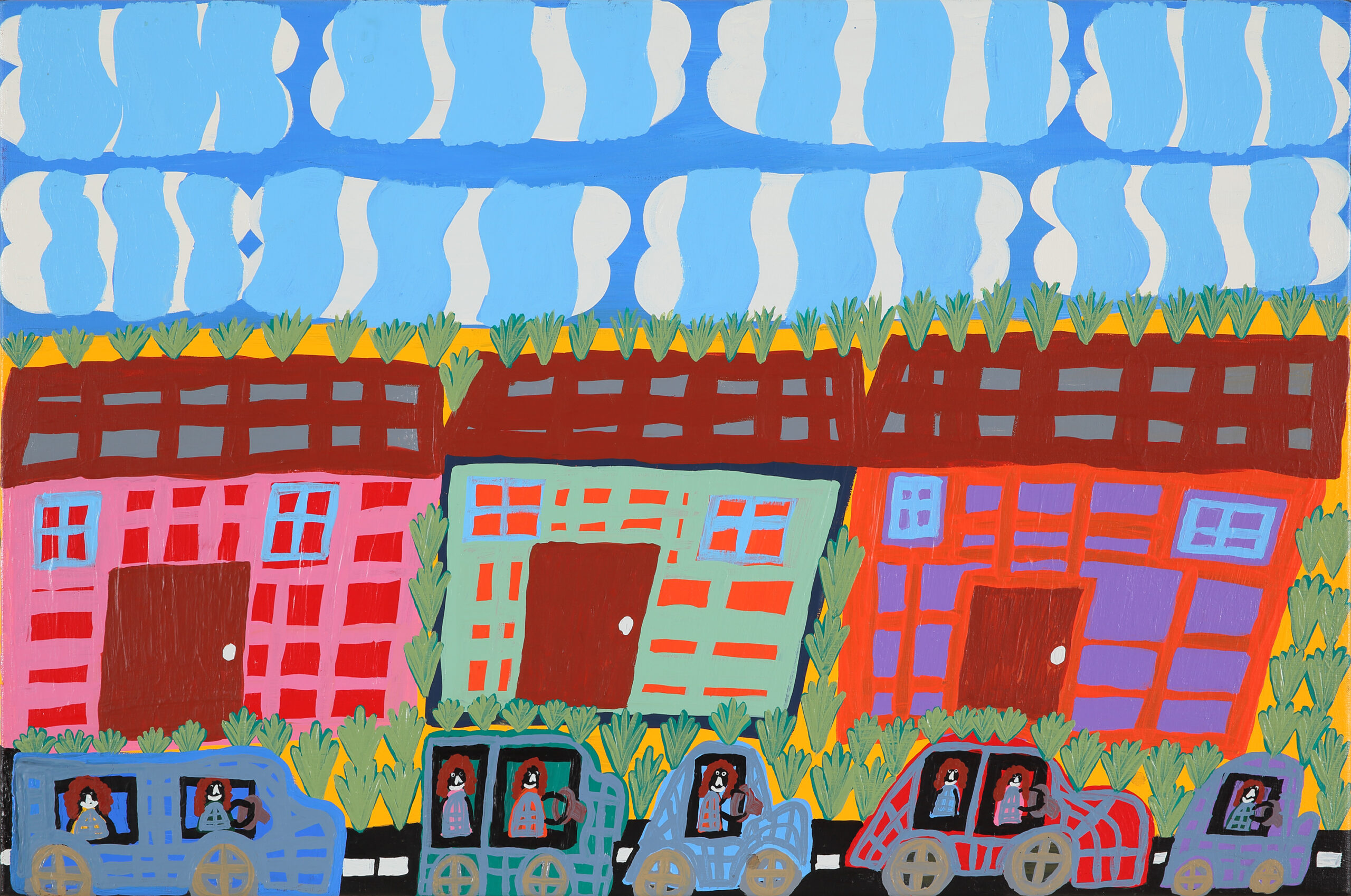 Born in Mparntwe (Alice Springs), Ingrid Williams is the granddaughter of established artist Marjorie Williams. Under her guidance, Ingrid began painting at Tangentyere Artists in 2021. Since that time, Ingrid has grown her practice to include painting, ceramics and jewellery. Ingrid paints figurative works which tell stories about Hermannsburg, the community where her mother was born. Within a year of working at the Tangentyere Artists studio, Ingrid began to translate these stories to clay. Her ceramic depiction of cars on their way to a footy match was exhibited at Desert Mob, 2023 and acquired by Artbank on the opening night. Ingrid was also selected as a finalist in the National Emerging Art Prize for her 12-piece ceramic work, Hermannsburg, which featured clouds, houses and cars in a dynamic scene.
