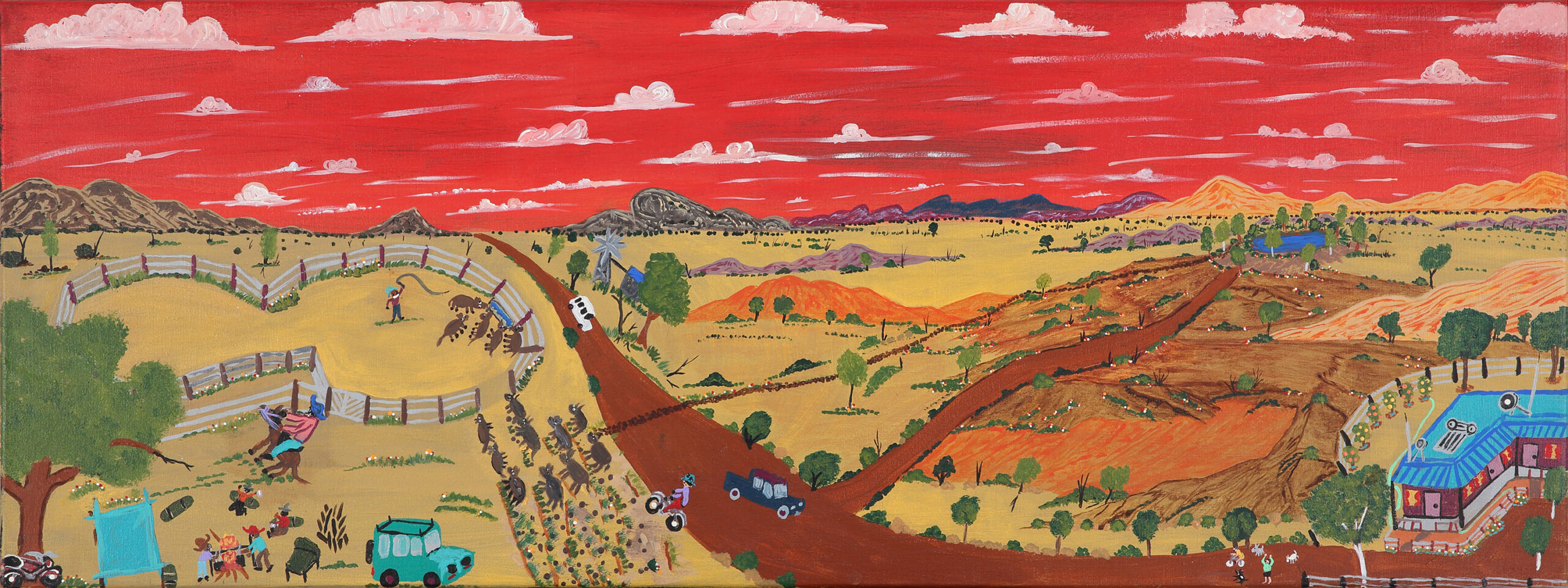 All the stockmen bring some cattle, put them in the yard at Maryvale Station. One man cooking damper, making tea. And one bloke bring some cattle down and one with a whip. Two blokes sitting, talking about the sunset going down, really nice. Two kids waiting for mother to come down with three dogs. They are sitting on the swags waiting for tea and damper.