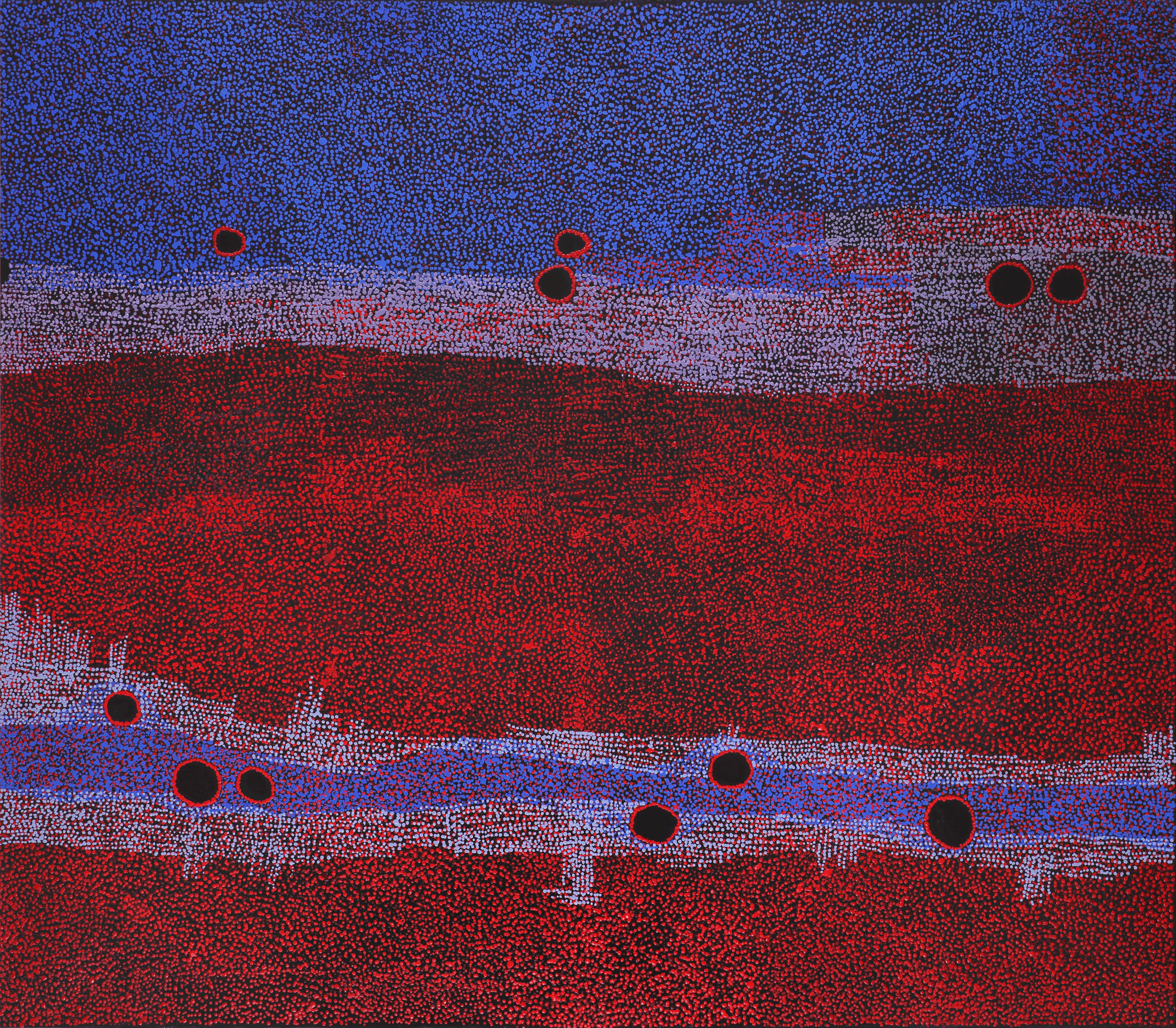 In this painting Muna Kulyuru has painted her mother’s father’s country, Watarru, in the Anangu Pitjantjatjara Yankunytjatjara (APY) Lands. Muna depicts her tjamu (grandfather’s) country and the Tjukurpa that animates it, relaying the narrative of Minyma Tjuta Tjukurpa – the story of many women – as it relates to the fire Tjukurpa, capturing their journeys as they travel across the country, singing, dancing, and creating the landscape as they go.