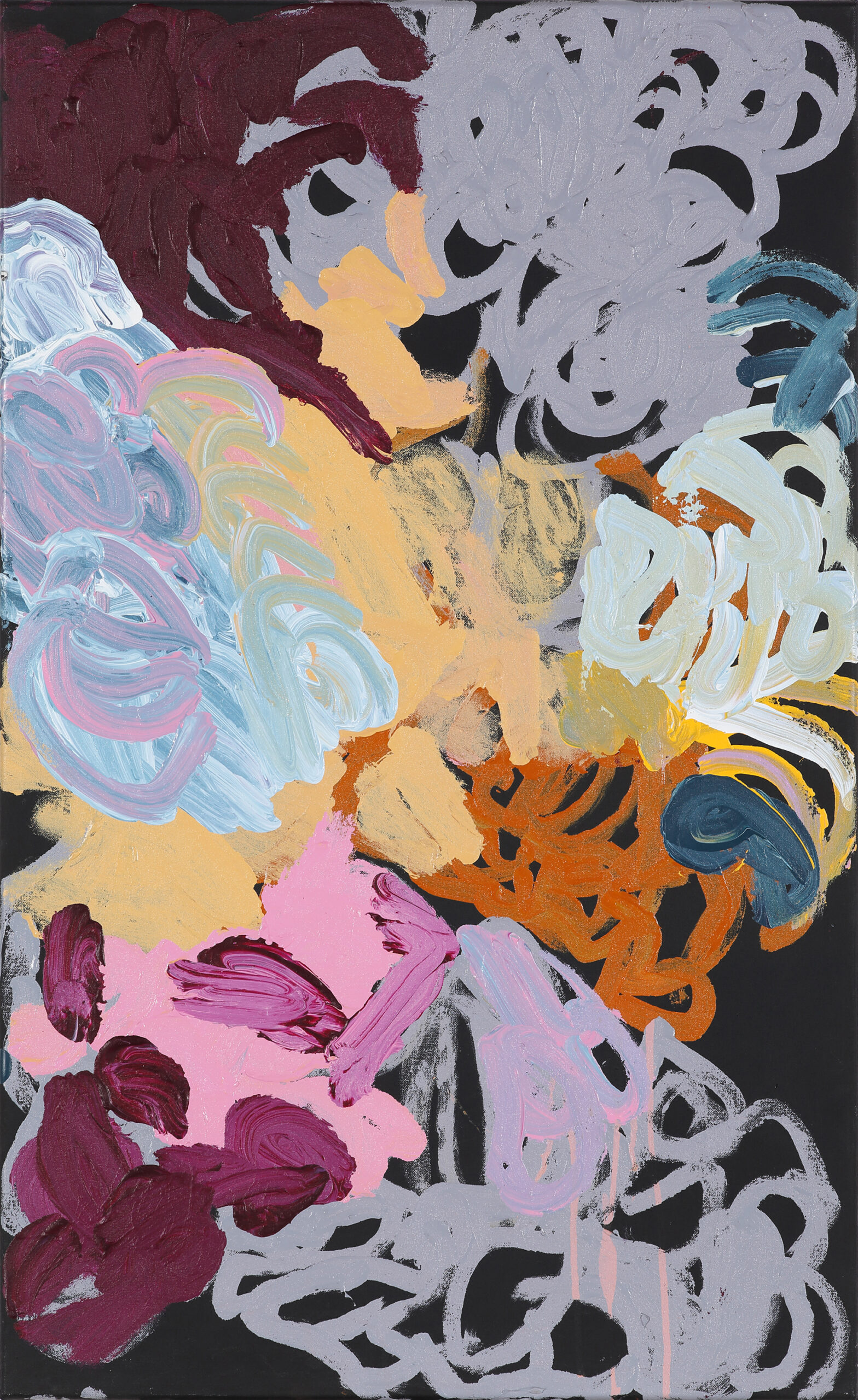 Pantjiti Unkari McKenzie’s works vibrate with movement and energy. Layering colours and patterns that refer to features of country and ceremonial markings, initial marks are often deliberately obscured and then echoed as she works the canvas. Her painting reflects her deep knowledge of place and culture. She paints this experience of country and inma (ceremony) depicting kapi tjukurla (rockholes), karu (creeks), tali (sandhills) and women’s ceremonial patterns.