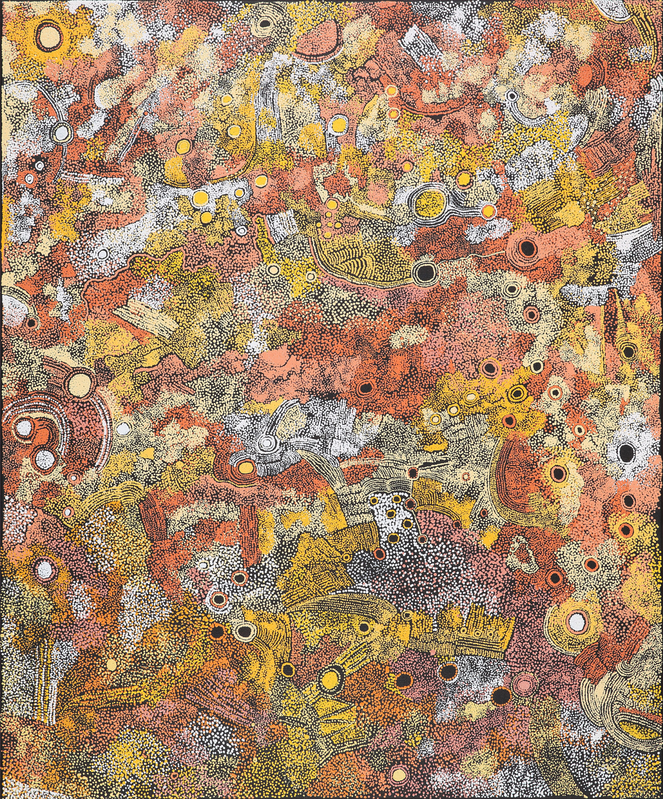 Through much effort she collected kampuṟarpa, wiriny-wirinypa, tawal-tawalpa, munu mai kutjupa-kutjupa (desert raisins, bush tomatoes, berries and many different wild foods). Maḻilu dug out a cave in the earth. It has a small opening but is a huge underground cave. She would hide her food there for when she was hungry or too tired to go out hunting. She would also perform inma in the cave. This is my country close to Kaṉpi Community.